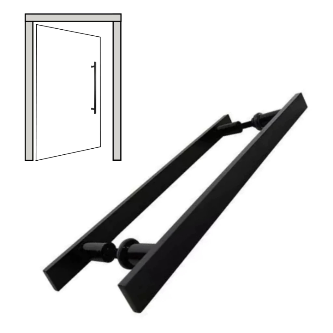 Puxador duplo especial 40 cm chato entre furos 30 cm para porta pivotante de madeira ou vidro na cor preto fosco. Além de resistente a corrosão natural que o contato com oxigênio pode causar, o puxador conta com tratamento de pintura eletrostática aumentando a durabilidade, não descasca, não escurece, não enferruja e não exige manutenção.