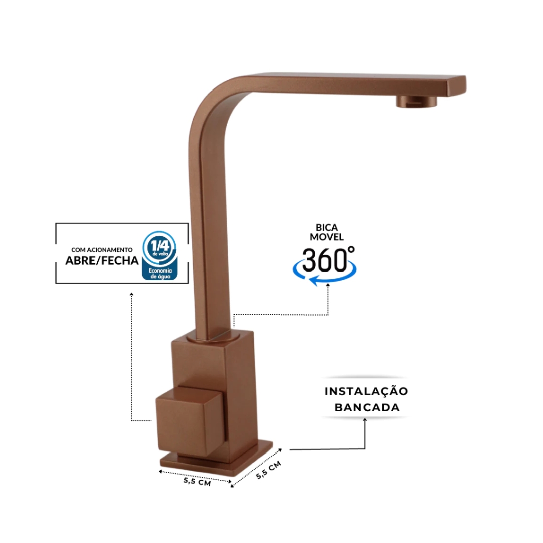 TORNEIRA BICA MÓVEL QUADRITT SLIM BANCADA LAVATÓRIO 4040 AÇO CORTEN